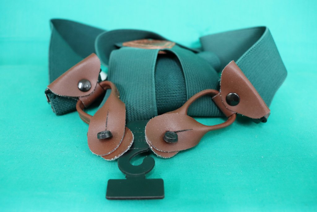 Mossgröna hängslen med brett kors i ryggen läder format som ett löv.