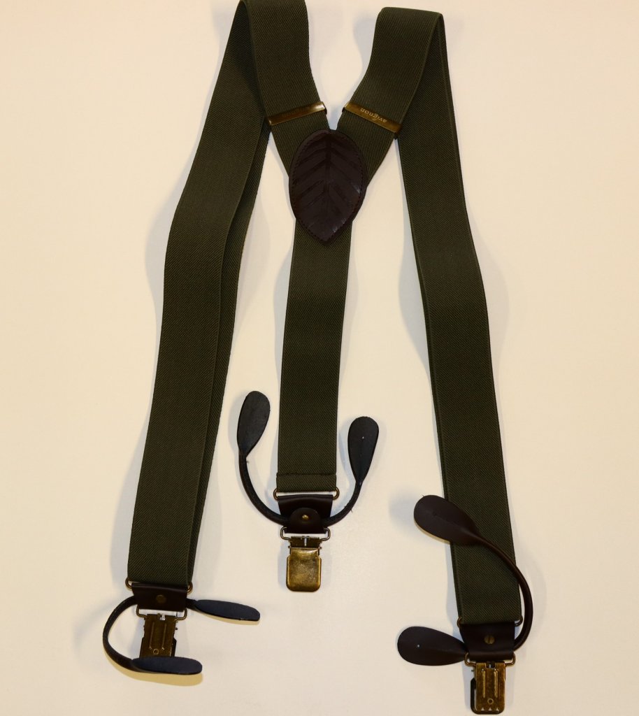 Mossgröna hängslen med brett kors i ryggen läder format som ett löv.